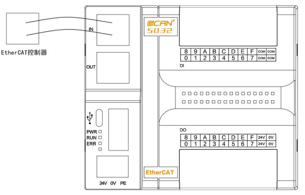 图 3.1 GCAN-5032 EtherCAT 远程 IO 模块与 EtherCAT 控制器连接