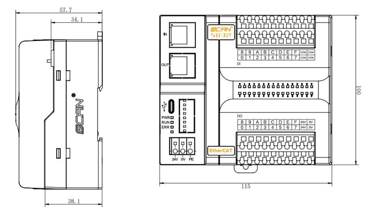 GCAN-5032 外观如图 2.1 所示,(长)115mm * (宽)100mm * (高)58mm。设备包含 2 个 EtherCAT 通信接口,一个 USB-Type C 接口,1 个电源接口,2 组 I/O电源接口(电源内部已短接),4 个 DI 的 COM 接口。USB 接口可用来升级固件。