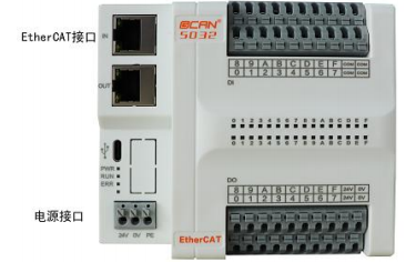 GCAN-5032模块集成2个 EtherCAT 通信接口,一个USB-Type C接口,1个电源接口,2组I/O电源接口(电源内部已短接),4个DI的COM接口。GCAN-4032模块的 EtherCAT 通信接口、电源接口位置如图2.4所示,接口定义如表2.2所示。