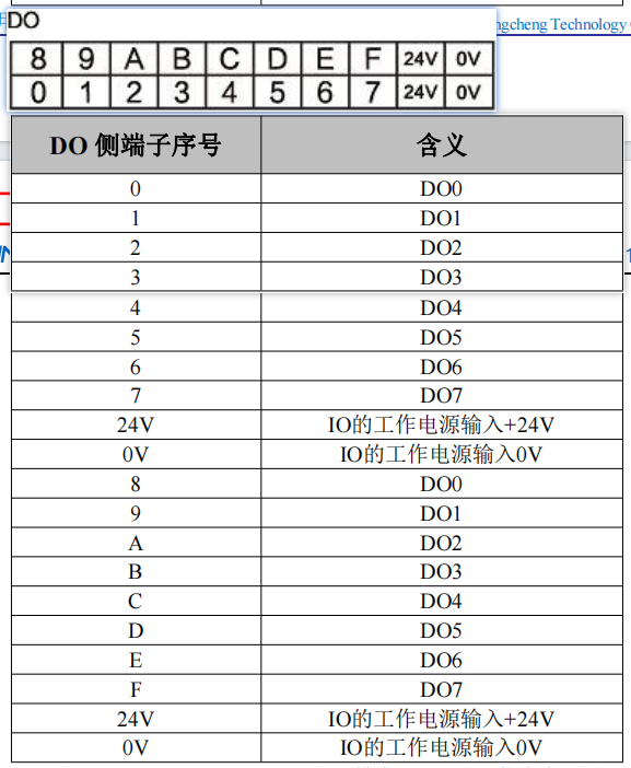 GCAN-5032 EtherCAT 远程 IO 模块的主控模块含有上下四排端子排,下方两排端子排为 DO 端子排,分别为 DO0~DO7,DO8~DOF 共 16 个数字量输出点,以及 2 组 IO 电源输入(请任选 1 组 IO 工作电源接口接入 24V 即可,注意同时需要接入系统电源,系统电源详见表 2.1,IO 工作电源与系统电源彼此隔离),如图所示。各个端子对应的序号及其含义如表 2.2 所示。