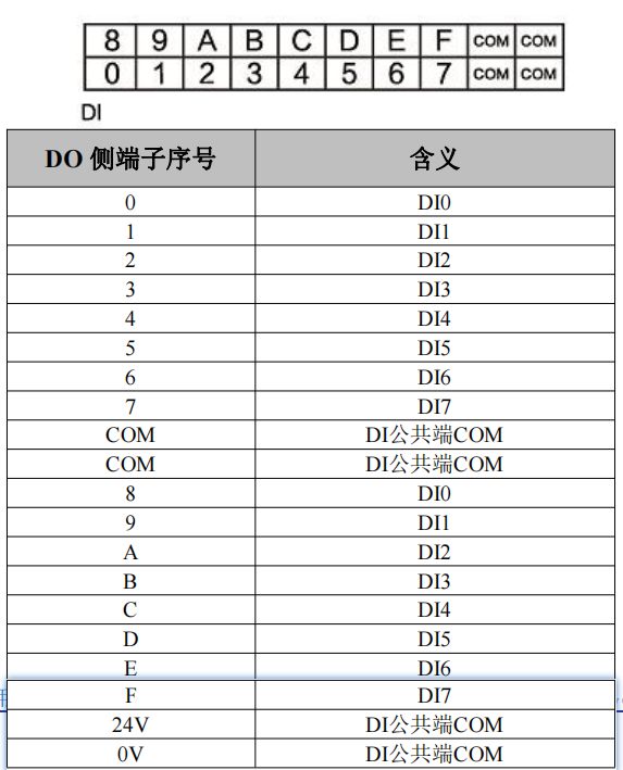 上方两排端子为 DI 端子排,分别为 DI0~DI7,DI8~DIF 共 16 个数字量输入点,以及 4 个 DI 的 COM 接口(4 个 COM 口任意连接 1 个即可),如图所示。各个端子对应的序号及其含义如表 2.3 所示。
