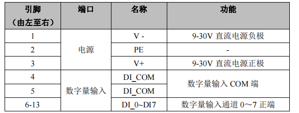 GCAN-4057模块集成一路 9-30V DC电源接口、1路标准CANopen接口、8路开关量输入接口、8路开关量输出接口。GCAN-4057模块电源接口、8路开关量输入接口位置如下图所示,接口定义如下表所示。