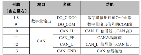 GCAN-4057模块CAN-bus通道,由1个4 Pin插拔式接线端子引出,可以用于连接1个CAN-bus网络或者CAN-bus接口的设备。GCAN-4057模块CAN-bus接口、8路开关量输出接口位置如下图所示,接口定义如下表所示。