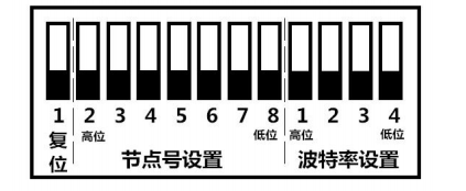GCAN-4057模块拨码开关如图2.4所示,GCAN-4057模块拨码开关最左侧为复位按键,默认在下方,上电时拨上,再拨下,重新上电后恢复出厂设置。复位按键右侧7位为节点号设置开关。最右侧4位为波特率设置开关。左侧为高位,右侧为低位。