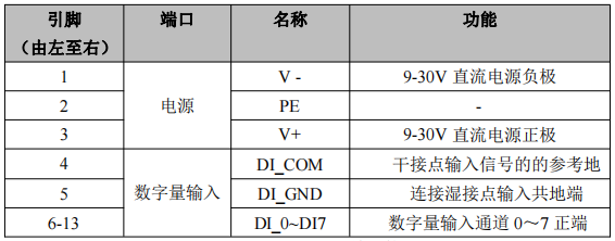 表 2.2 电源及 8 路开关量输入接口定义