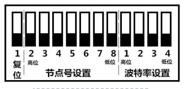 复位按键,默认在下方,上电时拨上,再拨下,重新上电后恢复出厂设置。复位按键右侧7位为节点号设置开关。最右侧4位为波特率设置开关。左侧为高位,右侧为低位。