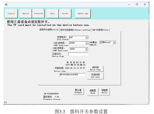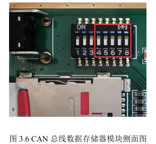 CAN总线数据存储器模块可以支持20K~1000K之间一组常用的波特率,可以通过操作设备内部的拨码开关,对波特率进行配置,拨码开关位置如图3.6所示。