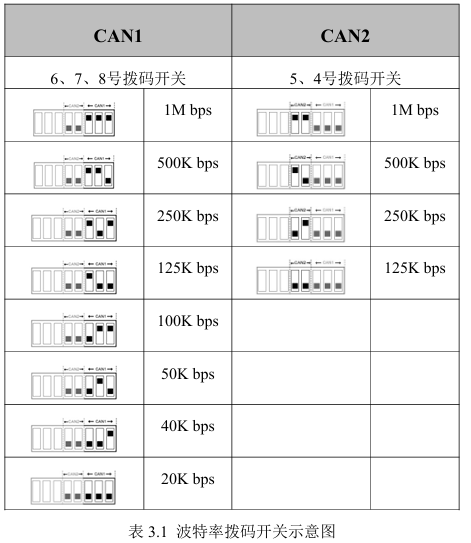 系统先不要上电,拨码开关的“4、5、6、7、8”号可以分别对CAN1和CAN2波特率进行配置,端子1有特殊定义,默认数字一侧,请勿随意设置。拨码开关向上默认为1(ON),向下为0(OFF),具体各波特率说明如表3.1所示。