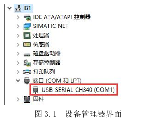 用户自行与配置软件连接需要使用USB线接到图2.2中的USB接口上,进入设备管理器找到串口号。如图3.1所示。
