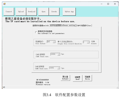 软件配置参数界面如图3.4所示,用户可以通过图3.3所示的界面,读取设备拨码开关设定的参数,勾选使用软件设定参数之后生效,GCAN-402D模块支持20k-1000k 全范围波特率,CAN总线数据存储器支持四种保存数据格式:二进制文件(.DAT)、文本文件(.TXT)、Vector软件可导入文件(.ASC)、批处理文件(.CAN),GCAN-402D默认是每分钟新建一个文件,将这一分钟收到的数据保存到对应的文件中,可以通过修改单个文件记录时长修改单个文件保存的数据时间。