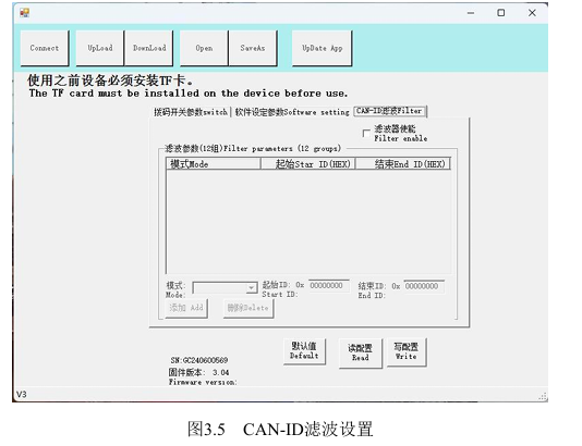 CAN-ID 滤波界面如图3.5所示,如需启用滤波,则需先勾选“滤波器使能”,之后对滤波参数进行设置。首先选择模式:扩展帧滤波或标准帧滤波,选择好后设置起始ID和结束ID,在这两个ID之间的帧ID均可正常保存,设置完成后点击添加,即可将其添加在滤波列表中,若不需要某条滤波参数,选中后点击删除即可。